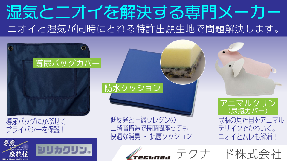 弊社は消臭と吸湿に特化した素材を開発し、新たな価値を付加し、適正な価格で市場に展開していきたいと考えています。今では一般家庭・工場・葬祭場・精密機械メーカー等、様々な場面でご使用いただいている実績のある製品です。医療業界へも参入させていただき消臭と湿気が強力に除去出来る素材(ファブリック)を使用した介護看護用品をご紹介します。また天日干しで機能が再生します
