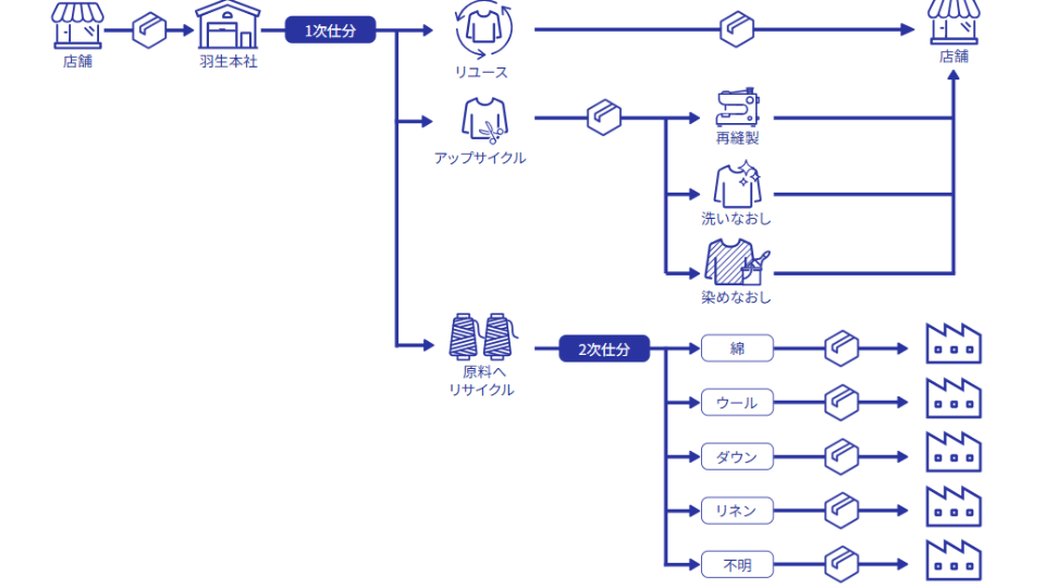 実店舗やEC店舗にてお客様から返品された、試着時についた化粧品などの汚れや、ひっかけた傷があるもの、強い臭いと不自然なシワがついてしまっている、そんな「不良商品」を再販可能な商品として再生させます。 近年のEC販売の増加とともに返品される商品も増加していく中、再生加工の仕組みは廃棄削減にもなり、SDGsの取り組みとしても今後ますます拡大していく事業です。